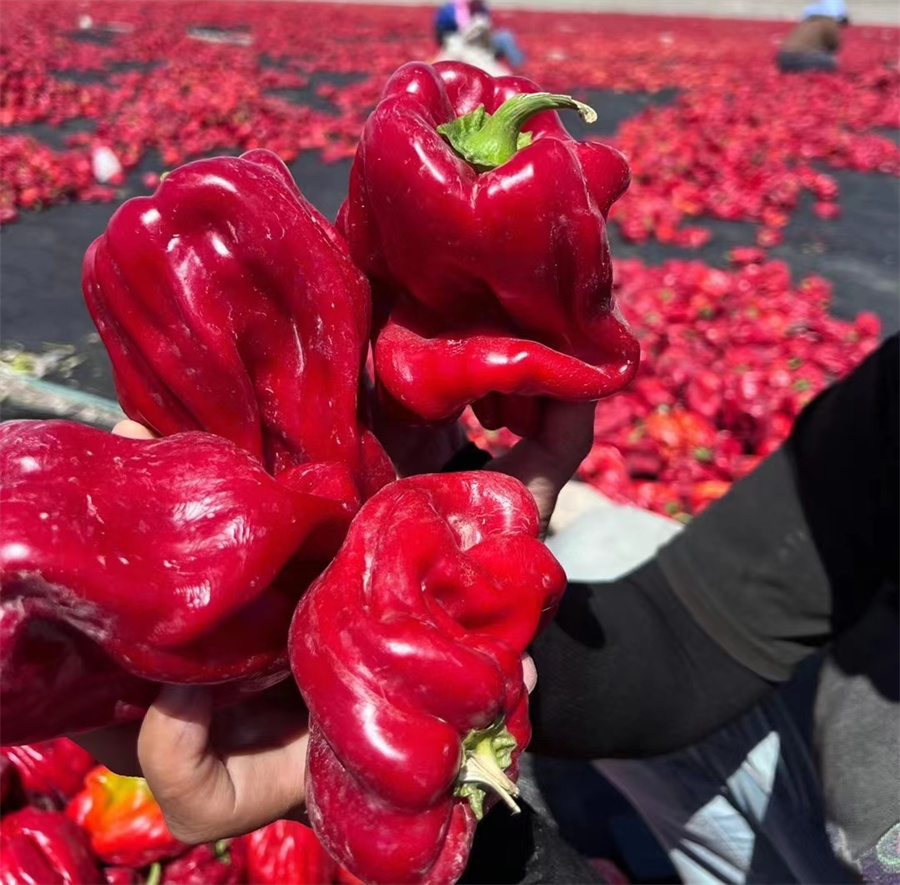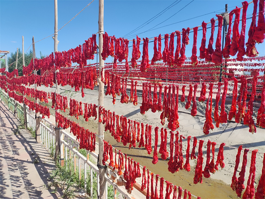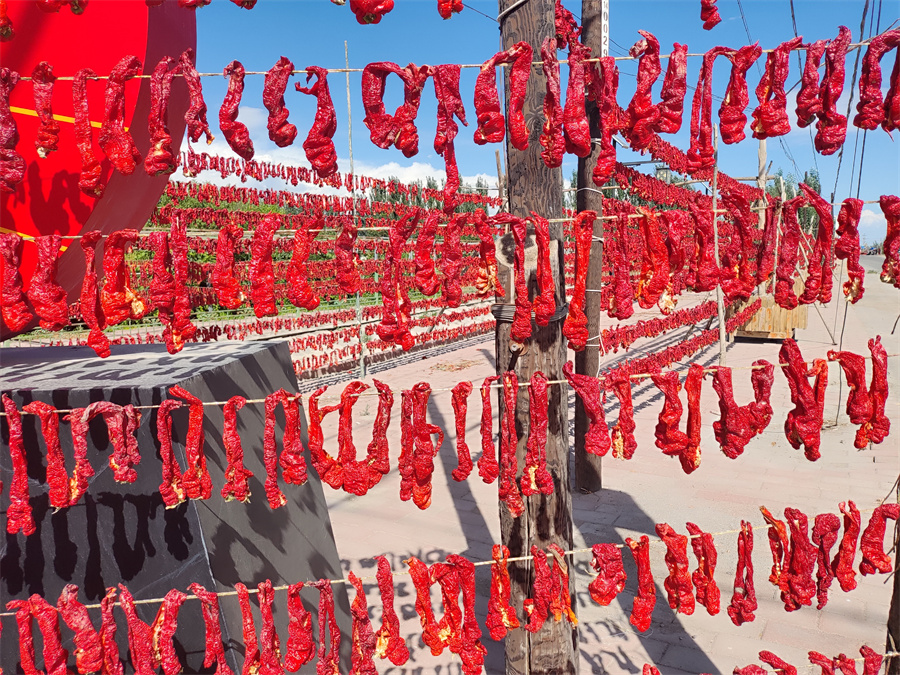 走进焉耆县乡镇村落,收获的辣椒在蓝天白云下修剪挂串、自然晾晒风干,一排排红彤彤的丰收场面,映红了老百姓的好日子,镌刻着村民火辣辣的幸福“丰”景。